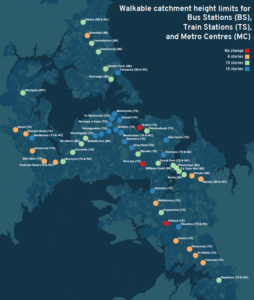 In making up for capacity lost from the townhouse direction and down-zoning to account for flood zones, Auckland Council has instead chosen to allow for much more height around core stations. Specifically: