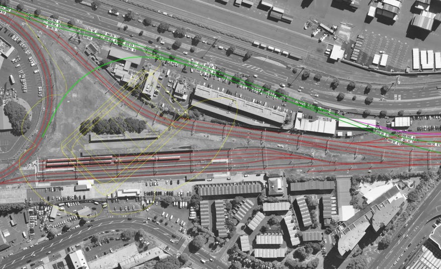 The proponent believes rail services would only need to be suspended for several weeks to connect the new green lines to the existing network. However, KiwiRail believes that disruptions to service are likely to be much longer, given the amount of work required, including dealing with signalling and power systems. It also intended to build apartments on a podium above the rail northeast of the site, immediately to the west of the Strand to Tamaki Drive Road bridge. This is also likely to require rail closures.