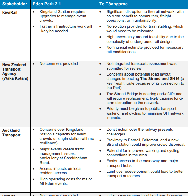 The council have also highlighted some of the feedback from some key stakeholders including Auckland Transport and Kiwirail. Notably, for Eden Park both seem to be suggesting that further upgrades to Kingsland Station and track infrastructure will be required. For Te Tōangaroa the concern is the rail network will be impacted for a long period of time