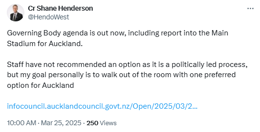 As a quick reminder, the Mayor started this process as a way to put an end to new, unfunded stadium proposals or upgrade plans for Eden Park popping up every few years, so that there was at least one preferred option. So, while a stadium is far from the most pressing issue for Auckland right now, this process does feel like a good idea as part of thinking how Auckland will grow and change.