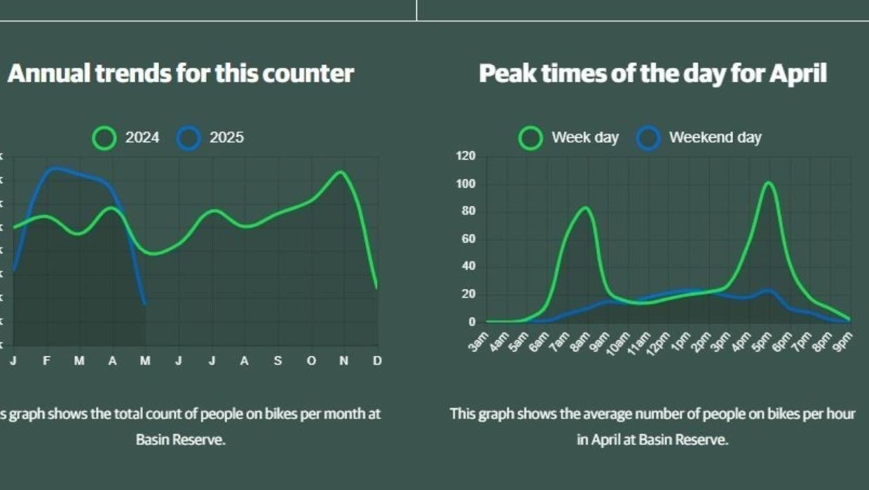 Wellington City Council’s monitoring camera at the Basin Reserve clocked 13,038 cyclists in April 2025, a 146% increase from 5286 in April 2023.